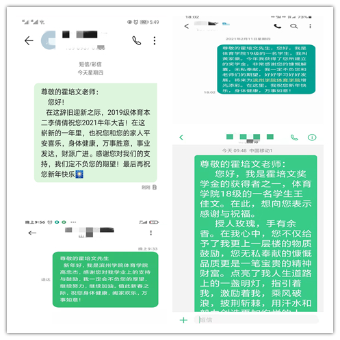 新年伊始,万象更新。在新春佳节到来之际,我院10名获得霍培文奖学金的学生通过短信形式,给捐赠者霍培文先生送去满满的新春祝福和感恩之情。获奖学生对捐赠奖学金表示感恩、感谢。表示霍培文先生对大学生的关注和支持,犹如一股春风,温暖人心,激励他们学习奋发向上,勇于拼搏,他们定将这化作一股力量,矢志奋斗,立志成才回馈学校,回馈社会。