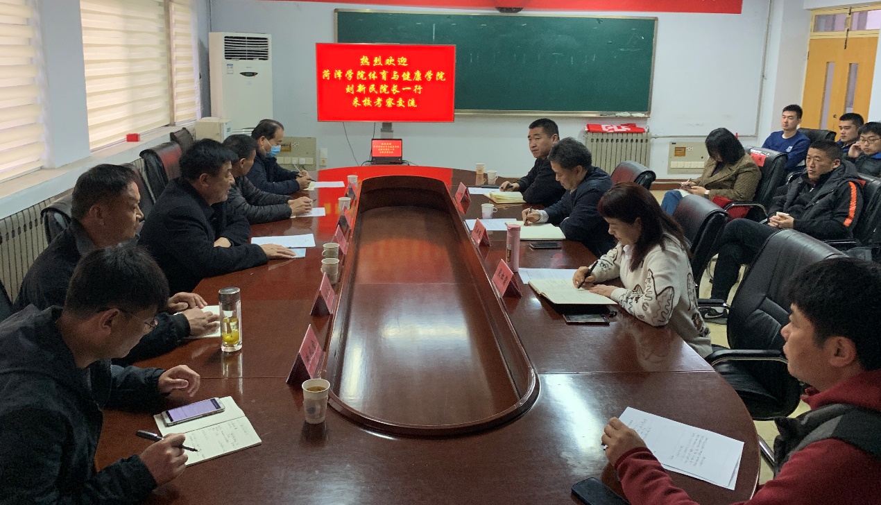 刘新民院长一行对我院近年来取得的办学成绩及全国基本功大赛的优异成绩给予高度评价,并对菏泽学院体育与健康学院的基本情况和来校交流内容做了介绍,并表示将加强学院交流,互相学习借鉴,促进共同提高。